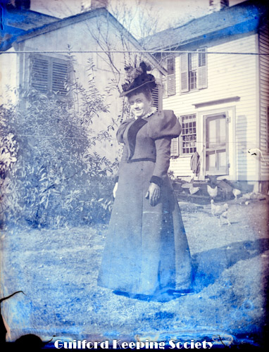 woman in dress and hat standing next to the back of a house with chickens c1910