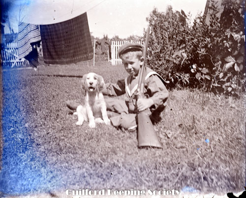 boy in sailor suit and cap sitting on lawn with rifle and puppy, laundry hanging in the background, croquet wickets c1910