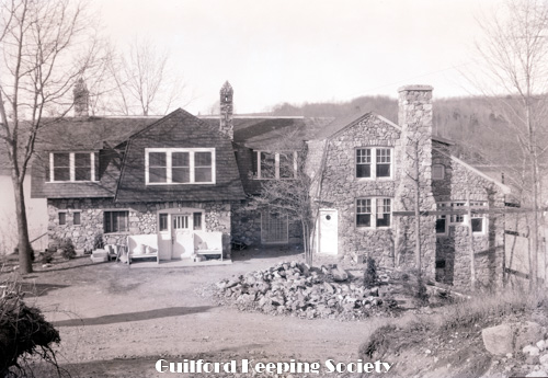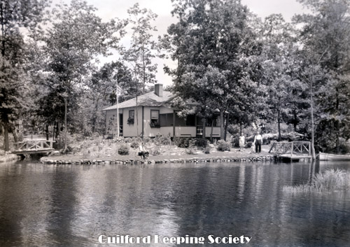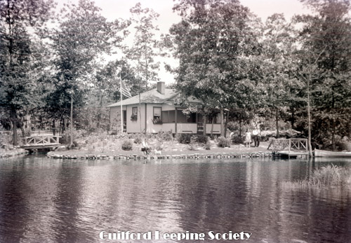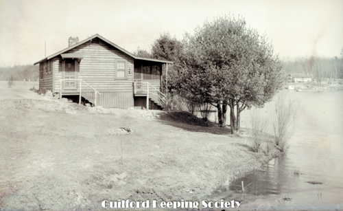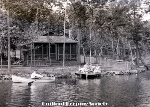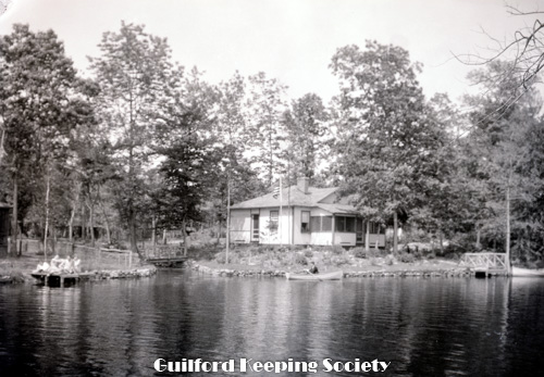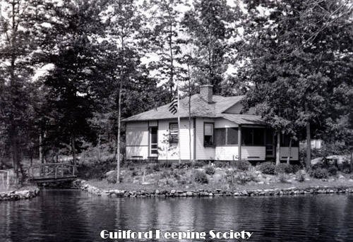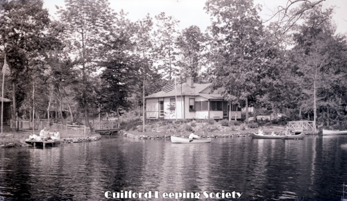 Guilford Lakes, side view of a log cabin cottage on a lake Guilford Lakes c1930