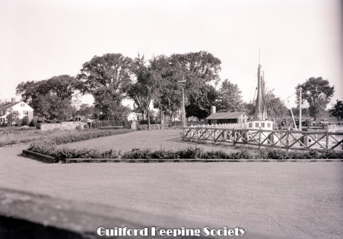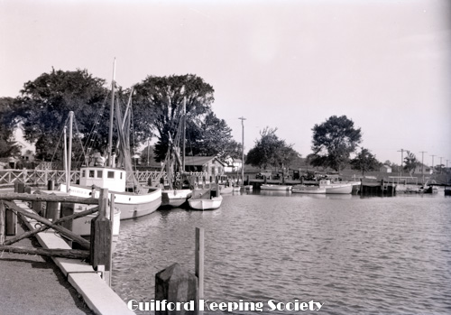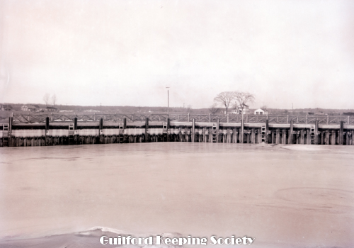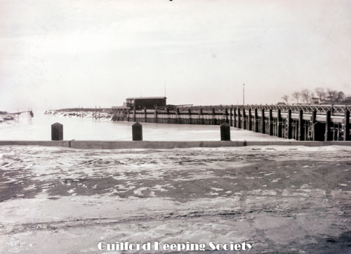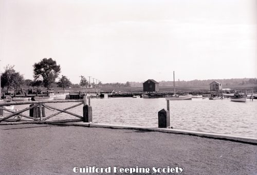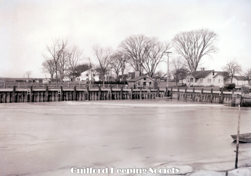 Sluice dock, taken from marsh, looking west. Houses on the left are on Seaside Ave Guilford town marina, sluice, at the south end of Whitfield St 33 Seaside Ave is on the right Feb. 7, 1931