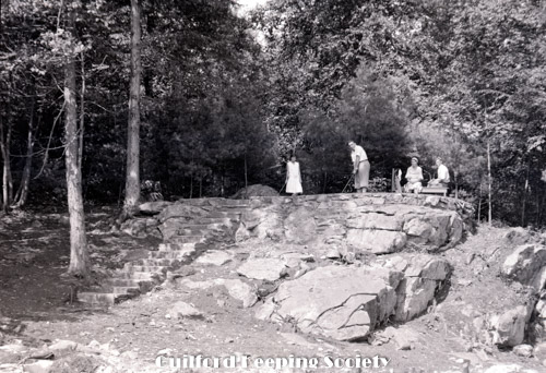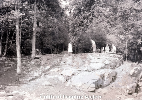 Guilford Lakes golfing, 2 people sitting on a bench, 2 golfing on top of ledge, stone staircase on the right Guilford Lakes c1930