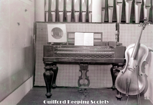 First Congregational Church, melodeon and cello, with organ pipes in background 110 Broad St c1930