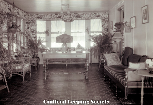 Mary Griswold Bullard and H. Milton Bullard Sr's house, couch, plants, table on one of the enclosed porches 376 State St 1926