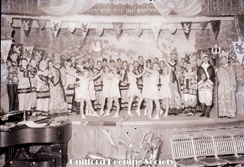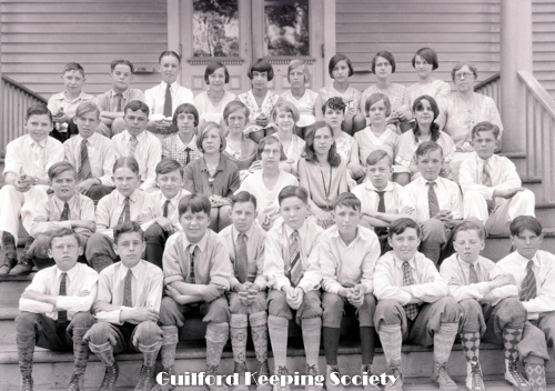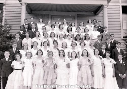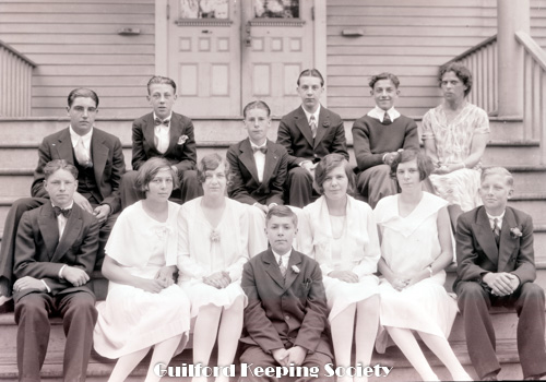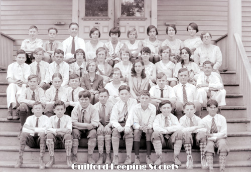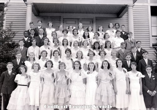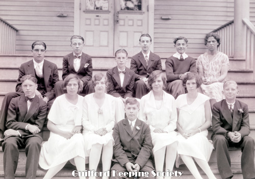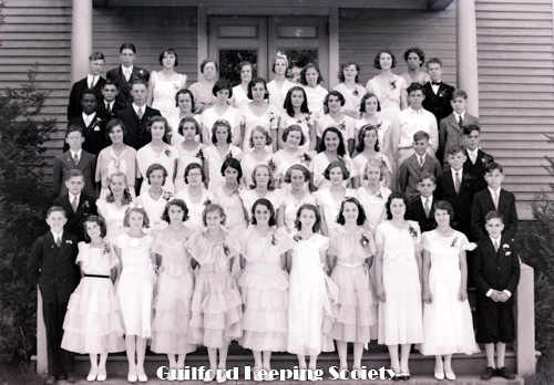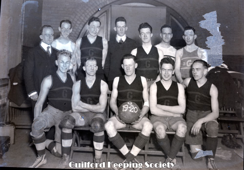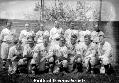 Guilford men's baseball team outside 14 in uniform saying Guilford WAA on the shirts probably behind Adam’s School, Church St c1935