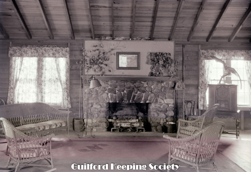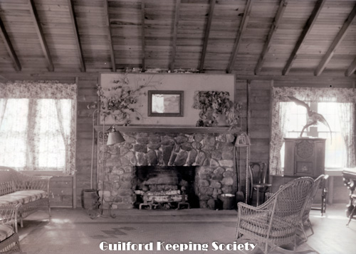 Guilford Lakes, interior of one of the cottages, stone fireplace in the center, stuffed bird on the right Guilford Lakes c1930