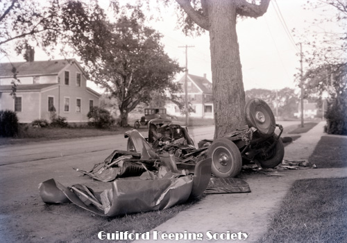 car accident on Boston St Nathaniel Fowler house at 276 Boston St is on the far right. Car demolished after hitting tree in front of the Fowler house Boston St 1926a