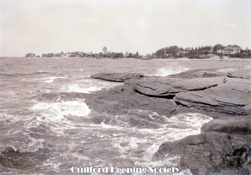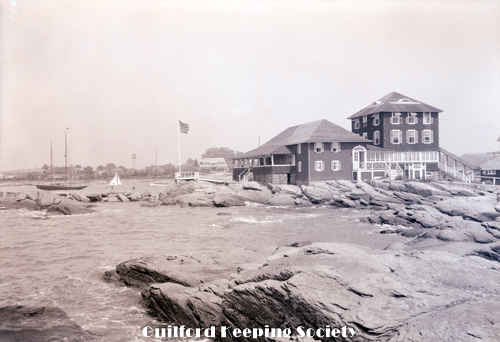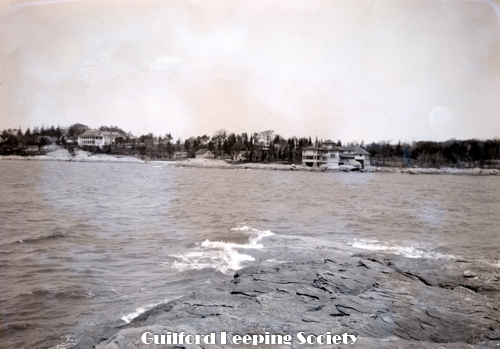 Sachem's Head Yacht Club, Chimney Corner Circle, as viewed from the rocks, on Uncas Point in the background note the Pope cottage on the left, E.C. Seward's Rock Lodge Chimney Corner Circle c1935