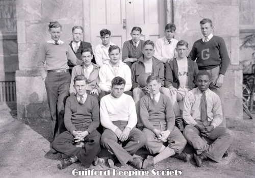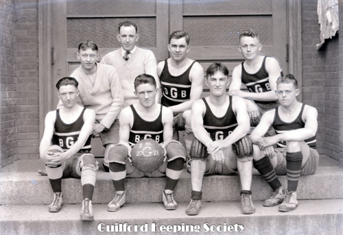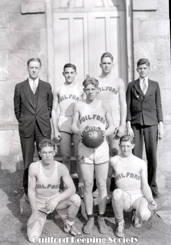 Guilford men's basketball team 5 in uniform, 2 men in suits, in front of the Guilford Institute, one holding a basketball GHS 33 120 North Fair St 1933