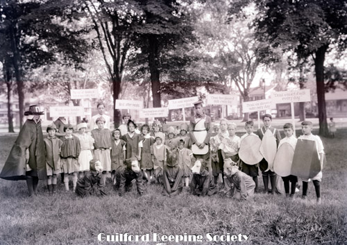 Public Health nurse pageant, group of about 24 children in costumes, 5 appear to be animal costumes, 8 are holding signs with health slogans, also several adults Green 1924