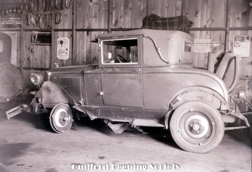 damaged car inside Clarence Norton's Garage 78 Boston St, northeast corner at Graves Ave c1925