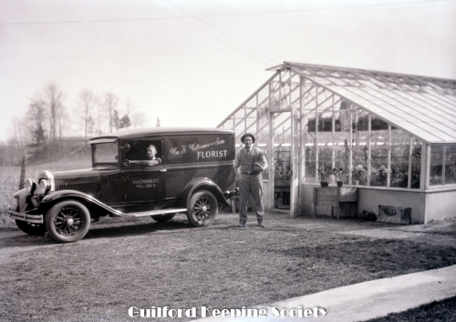 William H. Waltermire and Sons florist, man standing next to truck adjacent to greenhouse, became Hockings Garden Center still in business in 1999 1200 Durham Rd c1930