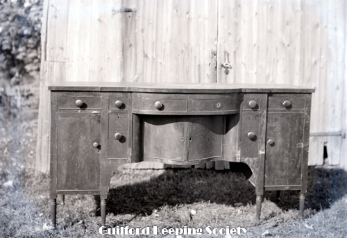 sideboard with round knobs sitting on the grass in front of a barn, Eva B. Leete's Antique shop possibly at Edward Leete’s accessory workshop 148 North Fair St c1935