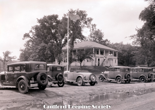 Guilford Lakes clubhouse with automobiles parked in front. Sign on the building Guilford Lakes Estates Clubhouse, one license plate 1930 Guilford Lakes 1930