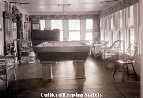 Mary Griswold Bullard and H. Milton Bullard Sr's house, pool table and wicker chairs on one of the enclosed porches 376 State St 1926