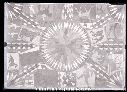 design on wooden plaque inlays of animals and figures