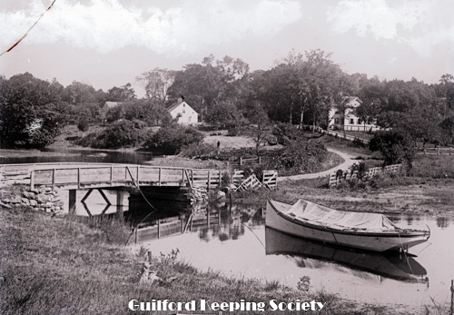 Howlett’s Bridge over East River with Parmelee’s boat moored in foreground, Amos Dudley 2nd house to left. William Lee Dudley house on right