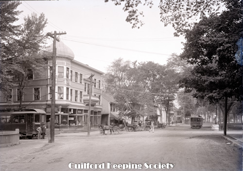 street scene at southwest corner of the Green. Monroe building on the left , trolley cars & horse drawn buggies