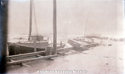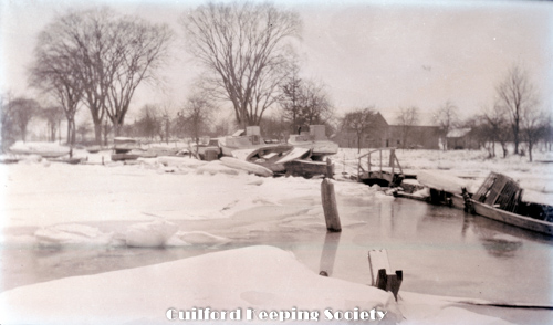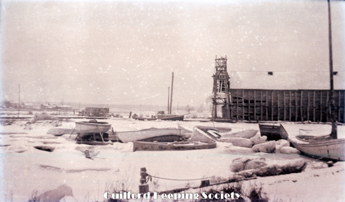 Sluice Basin in the winter, after a significant storm, corner of coal pocket is on the extreme left, very high tide, boats stuck in the ice in the basin Guilford Marina Basin c1920 Henry S