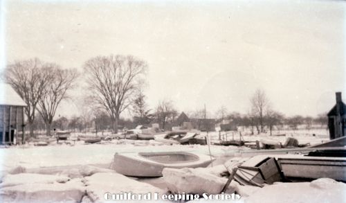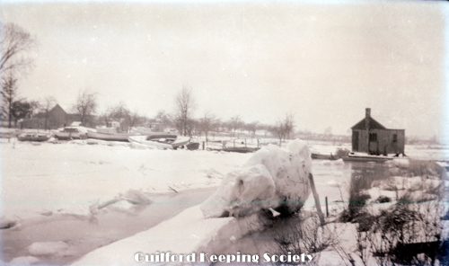 Sluice Basin in the winter, after a significant storm, fishing shack over to the right Guilford Marina Basin c1920 Henry S
