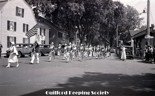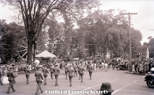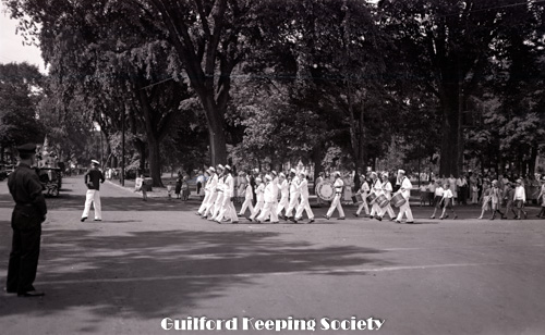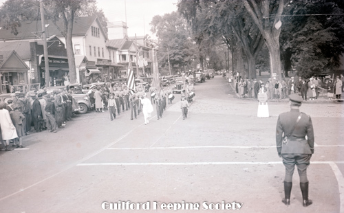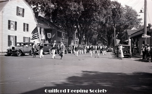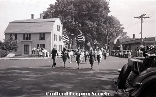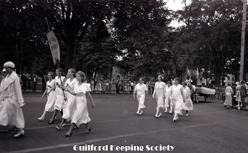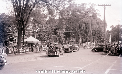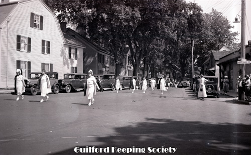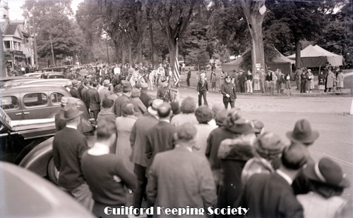 Guilford Fair parade, marchers on Whitfield St, tents visible on the Green on the right Whitfield St at the corner with Water St c1935 Henry S