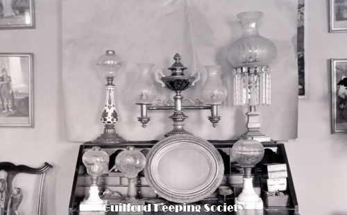 Eva B. Leete’s antiques, writing desk with 8 glass kerosene lamps Fair St and Boston Post Rd Fair St 98 c1920 Henry S