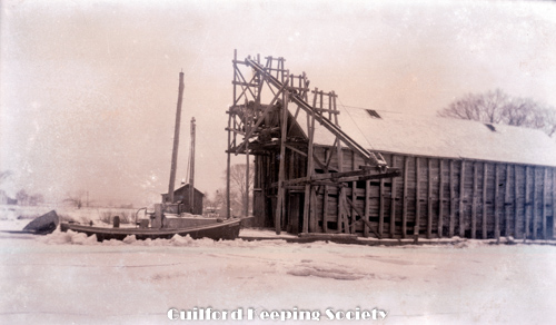 Coal Pocket at the sluice basin, boats in the ice in the basin, Harry Durant’s shanties on the left Guilford Marina Basin Whitfield St 505 c1920 Henry S