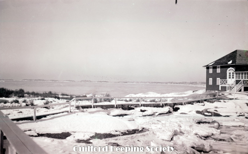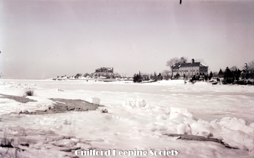 Sachem’s Head Yacht Club and rocks as viewed from the foot bridge in winter, flock of geese over the water Sachem’s Head Yacht Club c1935 Henry S