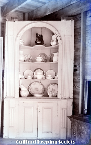 Eva B. Leete’s antiques, corner cupboard containing 4 shelves of plates and pitchers Fair St and Boston Post Rd Fair St 98 c1920 Henry S