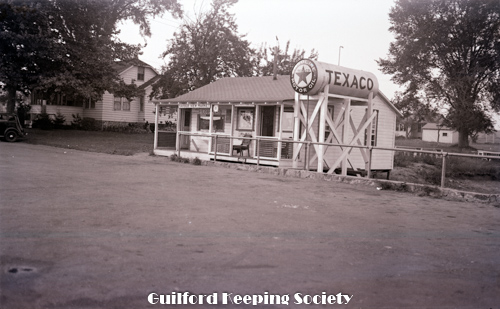 Boston Post Rd with gas station at intersection with Long Hill Rd going to the left, West River c1935 Henry S. Davis