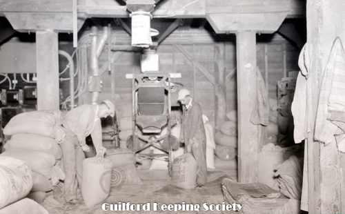 Morse and Sons Feed Mill, Cherry St machine filling grain bags 110 Cherry St c1930 Henry S