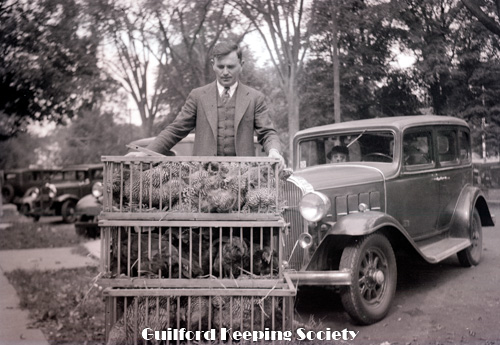 Guilford Fair parade, man standing with 3 crates of chickens, car behind him Green c1925 Henry S