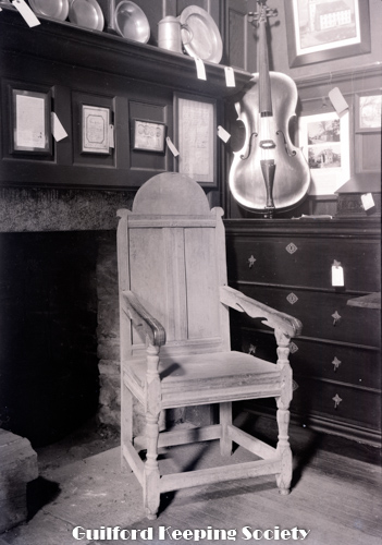 Henry Whitfield house, close-up of Governor Leete chair next to one of the fireplaces, violin hanging on the wall behind the chair 248 Old Whitfield St c1935 Henry S