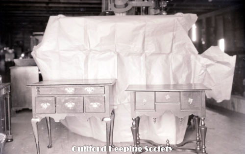 Eva B. Leete’s Antiques, 2 small tables one with slipper feet and each with several drawers Fair St and Boston Post Rd Fair St 98 c1920 Henry S