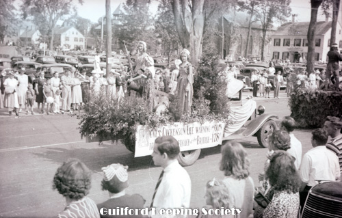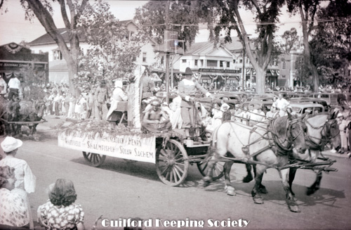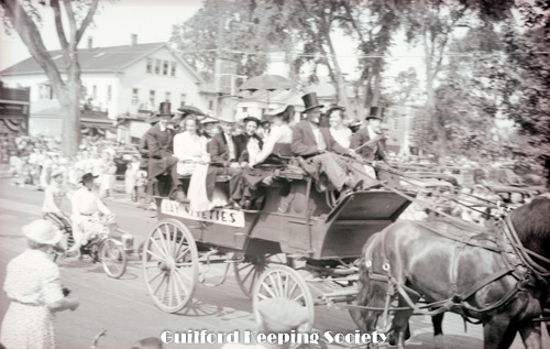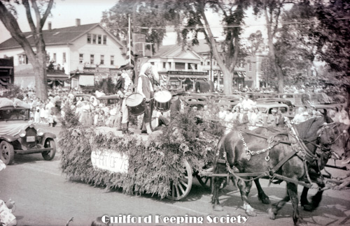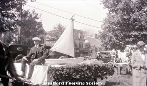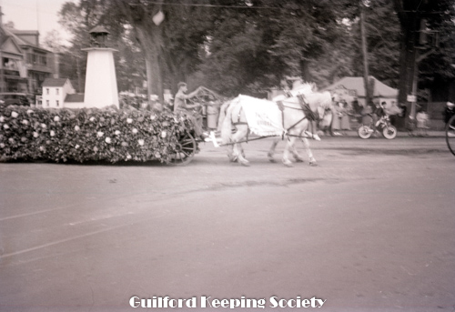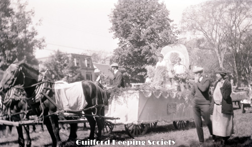 Guilford Fair parade, horse drawn lighthouse float from the Jones Bridge neighborhood as written on the blanket on the horses Whitfield and Water St corner c1925 Henry S