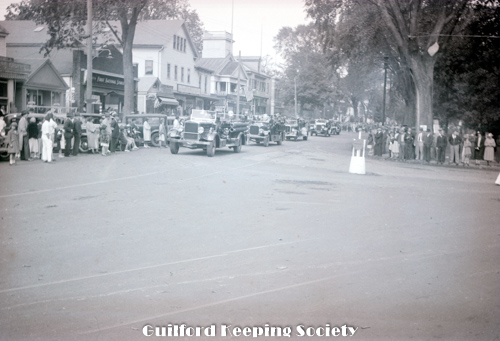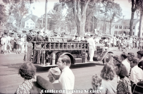 Guilford Fair parade, fire trucks in parade heading south on Whitfield St First National store on the left Whitfield and Water St corner c1925 Henry S