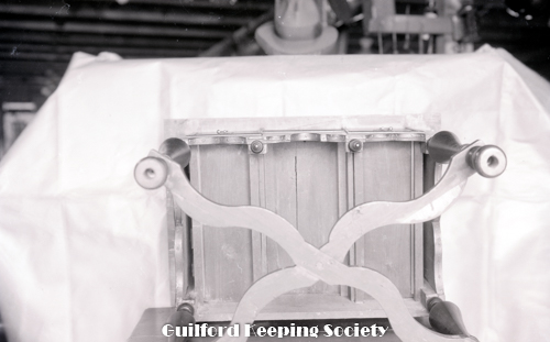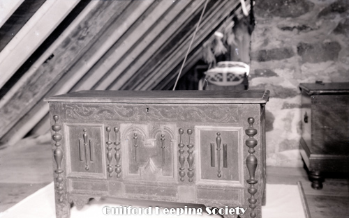 Eva B. Leete’s Antiques, blanket chest with intricate spool designs, in the attic of a building-note chimney stack in background Fair St and Boston Post Rd Fair St 98 c1920 Henry S