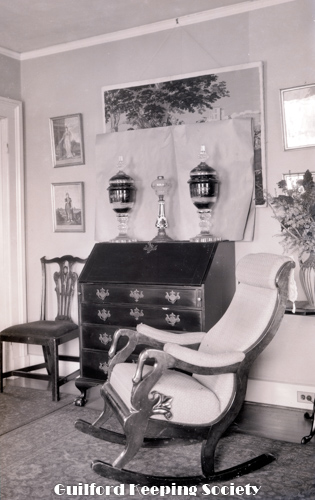 Eva B. Leete’s Antiques, large, upholstered rocker and other furniture in a room Fair St and Boston Post Rd Fair St 98 c1920 Henry S