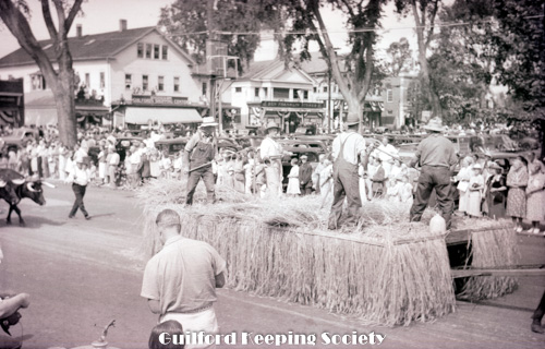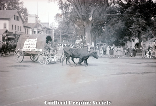 Guilford Fair parade, Guilford Republican Women’s oxen drawn float, wagon cover says SEND L--- from the prairie to the White House Whitfield St and Water St corner c1925 Henry S