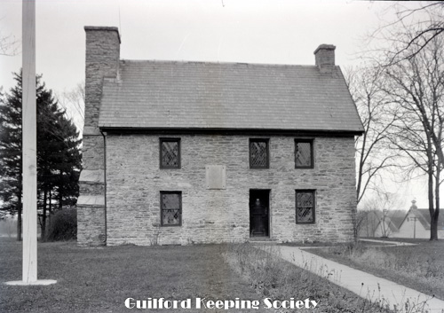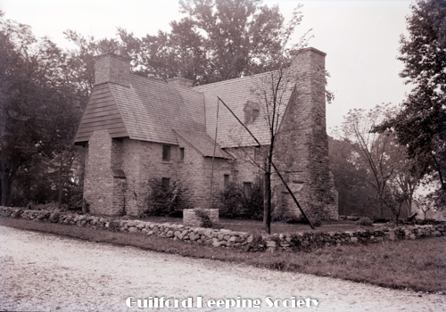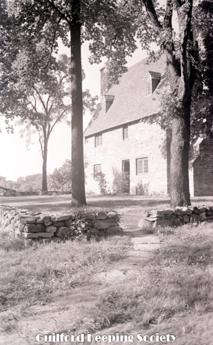 Henry Whitfield house, view of front framed by tall trees and showing stone walkway 248 Old Whitfield St 1936 Henry S
