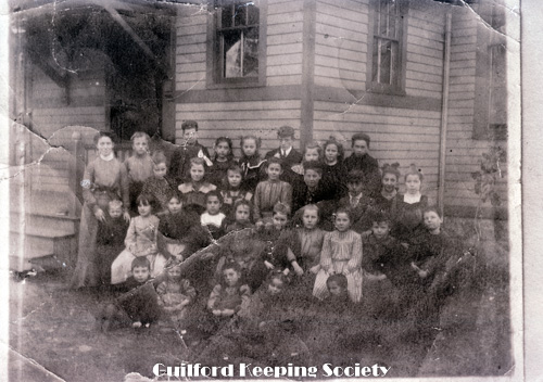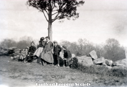 5 children and 2 women sitting on a stone wall under a cedar tree, perhaps a school class at Sachem’s Head school 340 Colonial Rd, possibly the Sachem’s Head school c1909 Oliver B