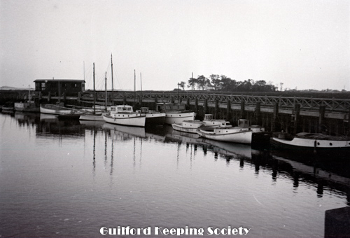 Guilford Town Marina basin looking south down the channel into Long Island Sound, boats tied up on the right Guilford Town Marina, southern end of Whitfield St c1930 Henry S
