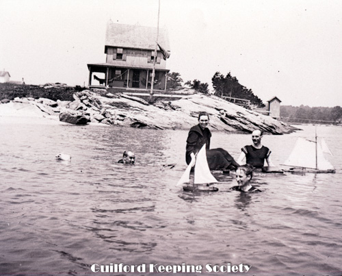 Mulberry Point summer cottage Sea Spray perched on the rocks, with 4 adults swimmers playing with model boats Mulberry Point c1900 Shelton W. Dudley Sr