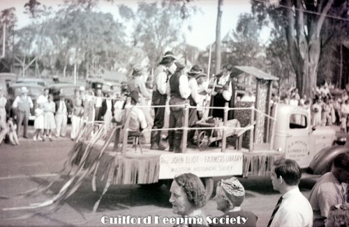 Tercentenary Parade float on flatbed truck, Madison Historical Society float Rev. John Eliot farmer’s library Green, Boston St Sept 4, 1939 Henry S
