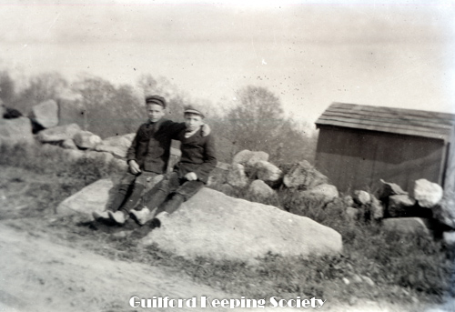 two boys with knickers and caps sitting on a rock with a small outbuilding in the background c1909 Oliver B