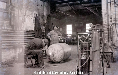 Clarence Norton garage interior, man using acetylene torch 78 Boston St at the northeast corner with Graves Ave. c1940 Shelton W. Dudley Sr
