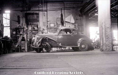 Clarence Norton garage interior, wrecked car in for repairs 78 Boston St at the northeast corner with Graves Ave. c1940 Shelton W. Dudley Sr
