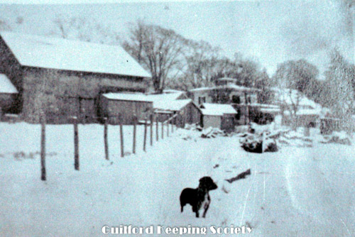 Dog in the snow near the barn behind John L. Seward house at 79 Boston St In the background is 39 Boston the Benjamin Bradley house. Shelton W. Dudley Sr