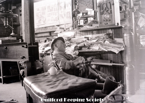 Clarence Norton garage interior, worker sleeping in a chair 78 Boston St at the northeast corner with Graves Ave. c1940 Shelton W. Dudley Sr