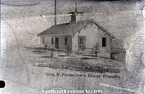 George B. Parmelee’s brass Foundry, from Irvine 1852 wall map engraving 1852 Shelton W. Dudley Sr