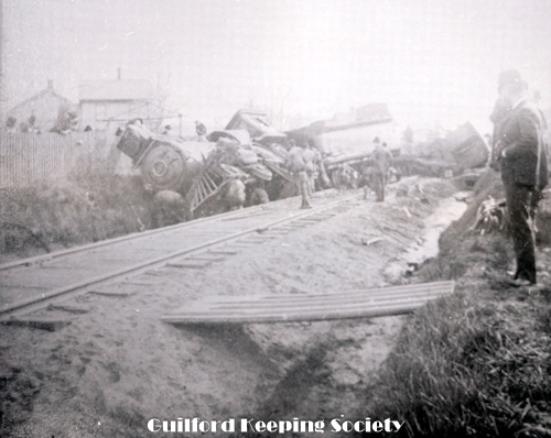 Railroad wreck, steam engine and car off the track. Note the single track of the old Shoreline Railroad Old Whitfield St, possibly near railroad depot c1890 Shelton W. Dudley Sr